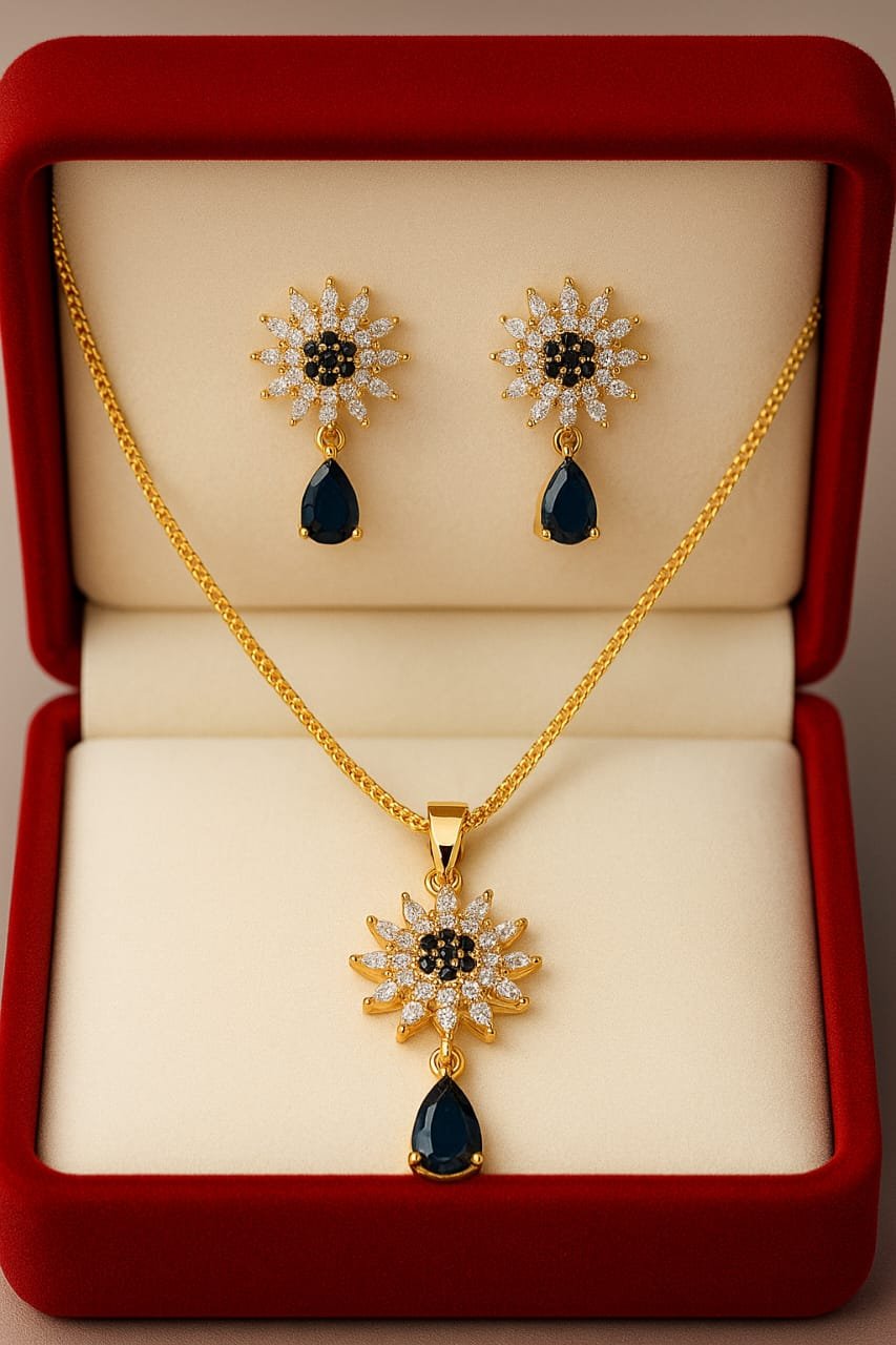 Elegant pendant and matching earrings set featuring a radiant rosette design with shimmering stones and dangling teardrop accents.