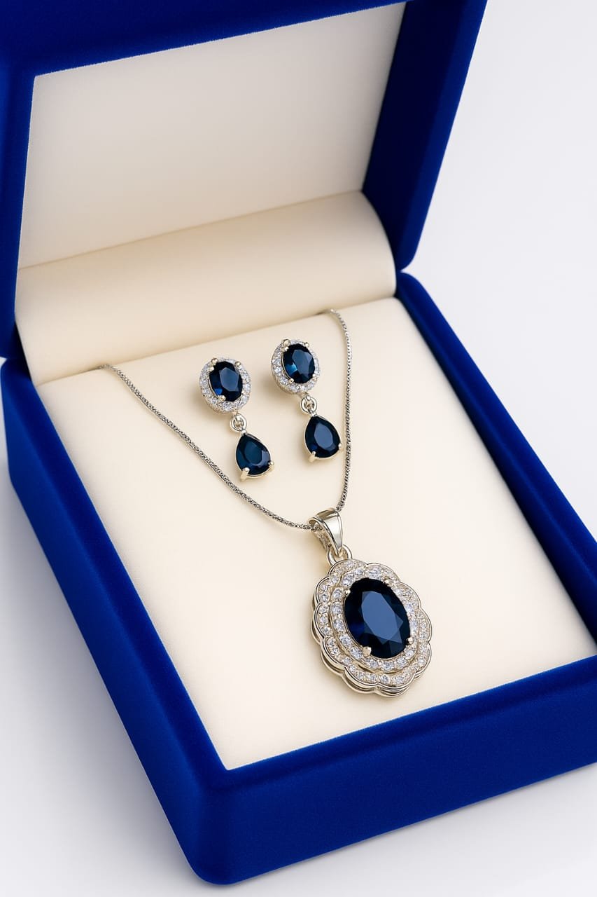 Elegant blue sapphire pendant set with matching earrings in a silver-toned frame, presented in a luxe blue jewelry box.