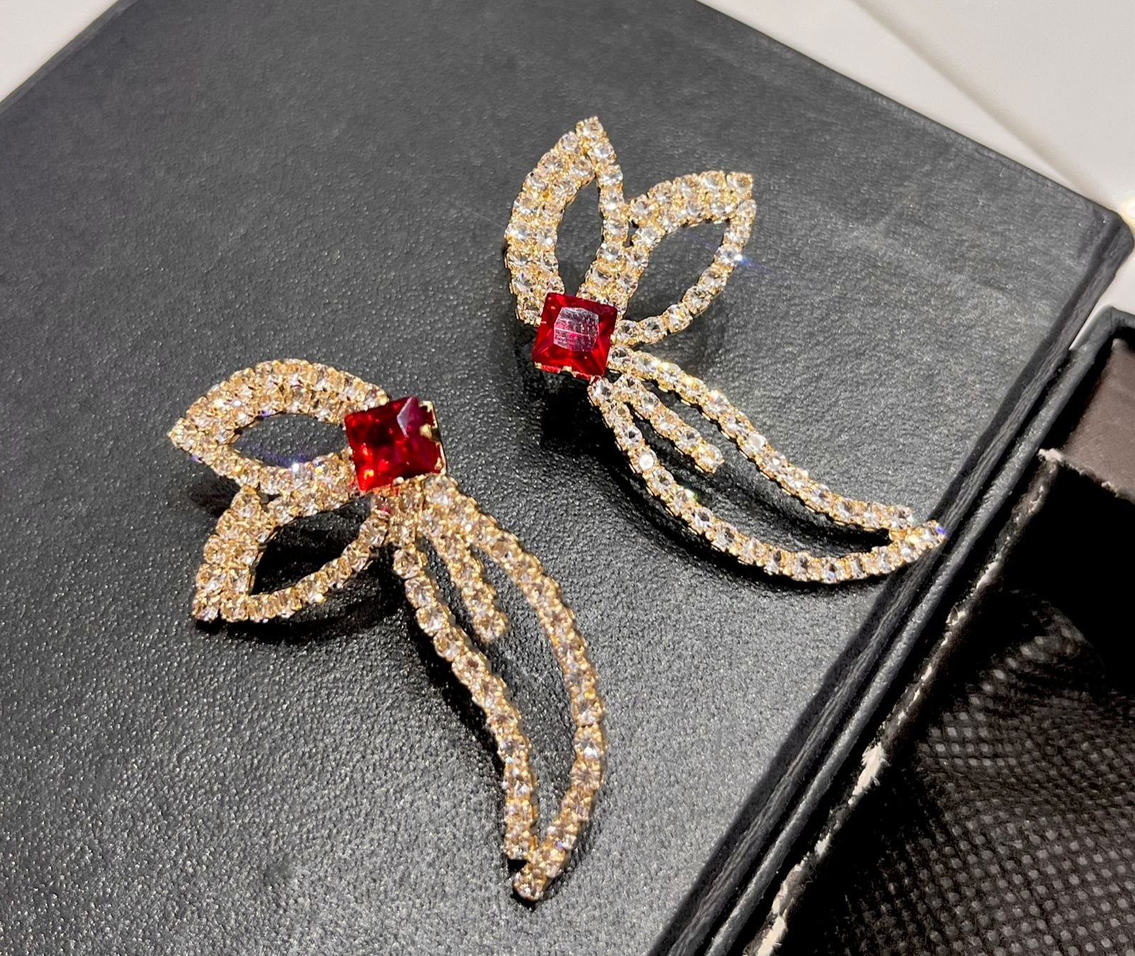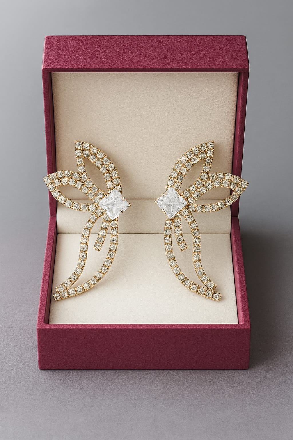 Delicate butterfly-wing shaped earrings crafted in yellow gold tone and adorned with sparkling pavé diamonds tone crystals and a central princess-cut stone — lightweight, elegant design perfect for weddings, anniversaries, and everyday luxury.