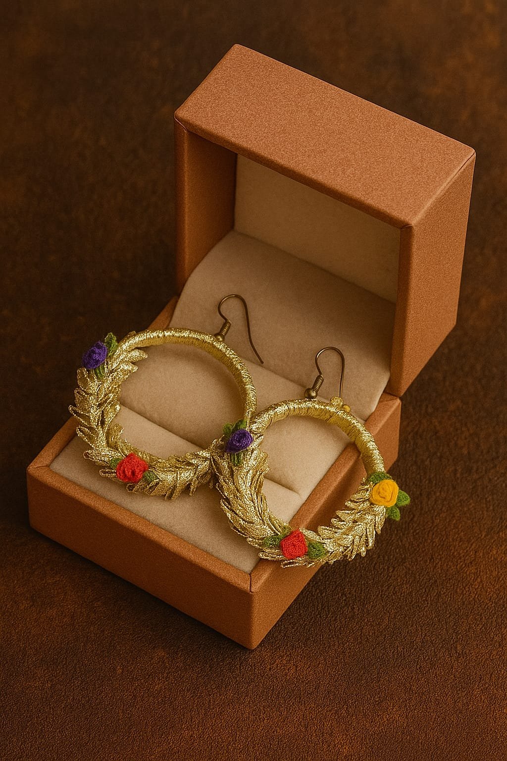 Handcrafted embroidered hoop earrings featuring delicate floral accents and textured leaf detailing — lightweight, artisanal design perfect for boho-inspired and statement looks.