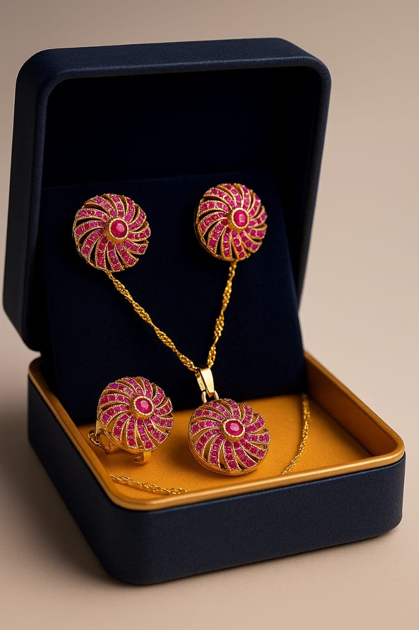 Intricately designed swirl pendant, matching earrings, and ring with detailed filigree work and sparkling accents — ideal for festive wear and gifting.