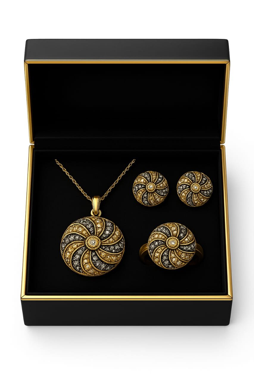 Intricately designed swirl pendant, matching earrings, and ring with detailed filigree work and sparkling accents — ideal for festive wear and gifting.