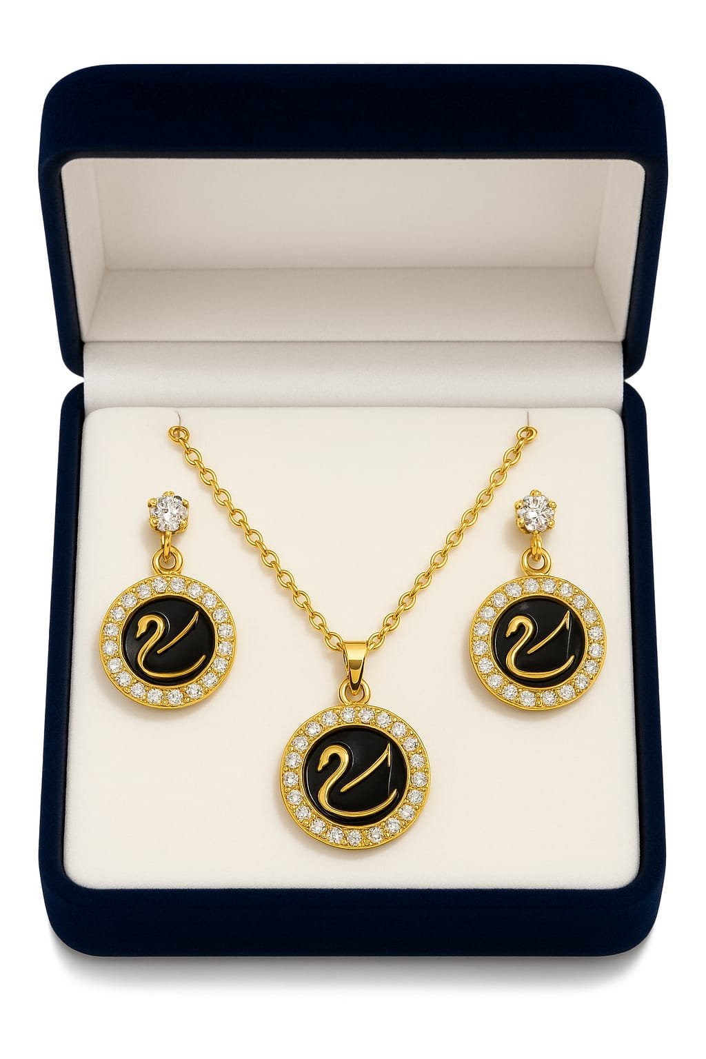 Elegant gold-tone necklace and matching earrings featuring black enamel swan medallions surrounded by sparkling crystals — a chic, gift-ready set for formal events or everyday glamour.