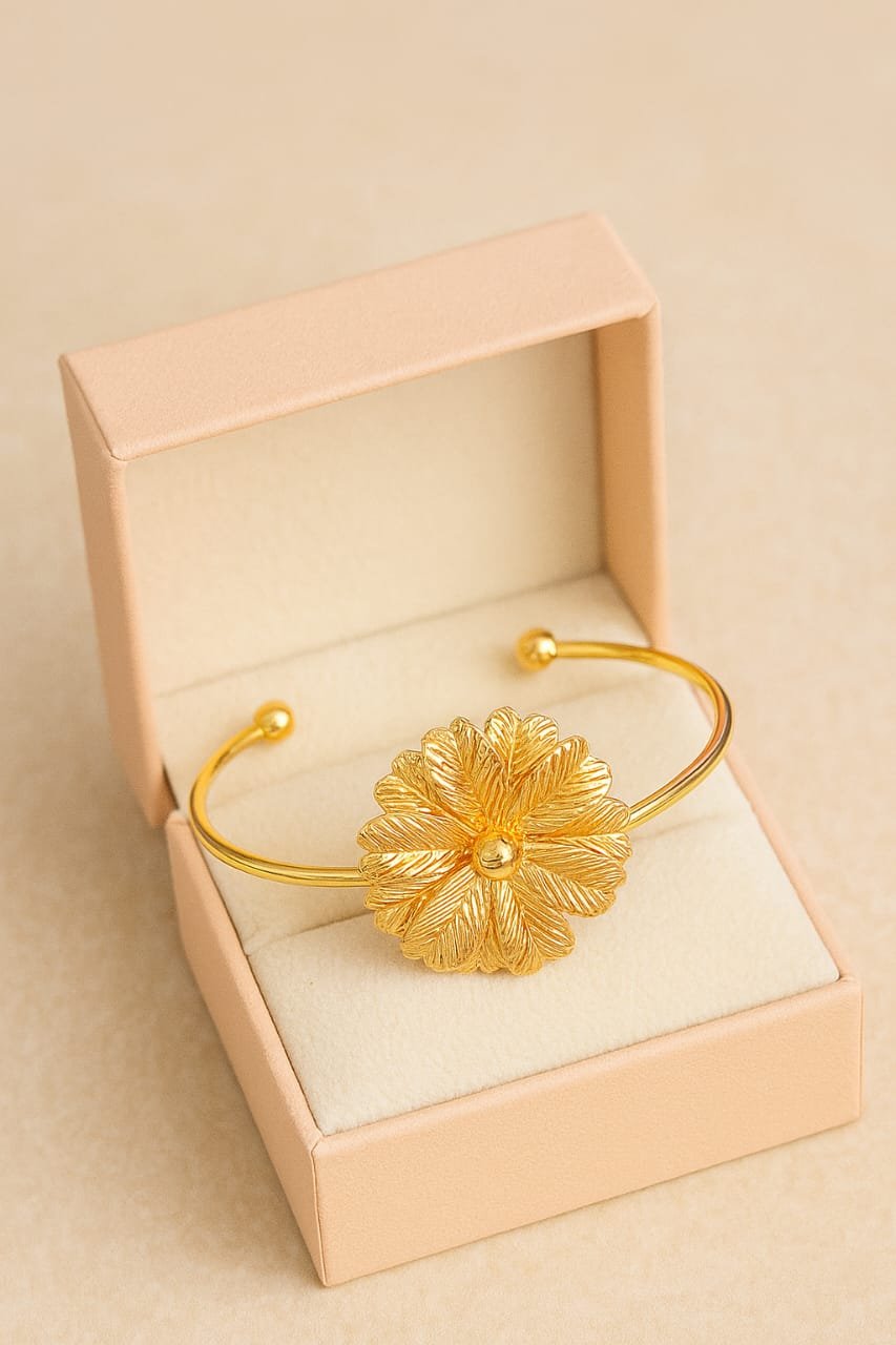 Elegant gold-tone floral handcuff featuring a sculpted multi-petal centerpiece with a polished bead detail—perfect for adding a feminine, statement touch to both daytime and evening looks.