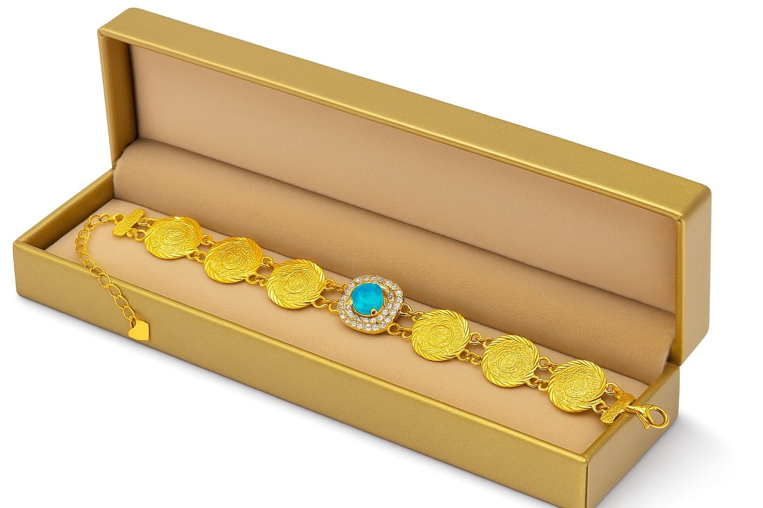 Gold-polished coin chain bracelet with textured coin links and a sparkling turquoise center stone — timeless elegance for everyday wear.