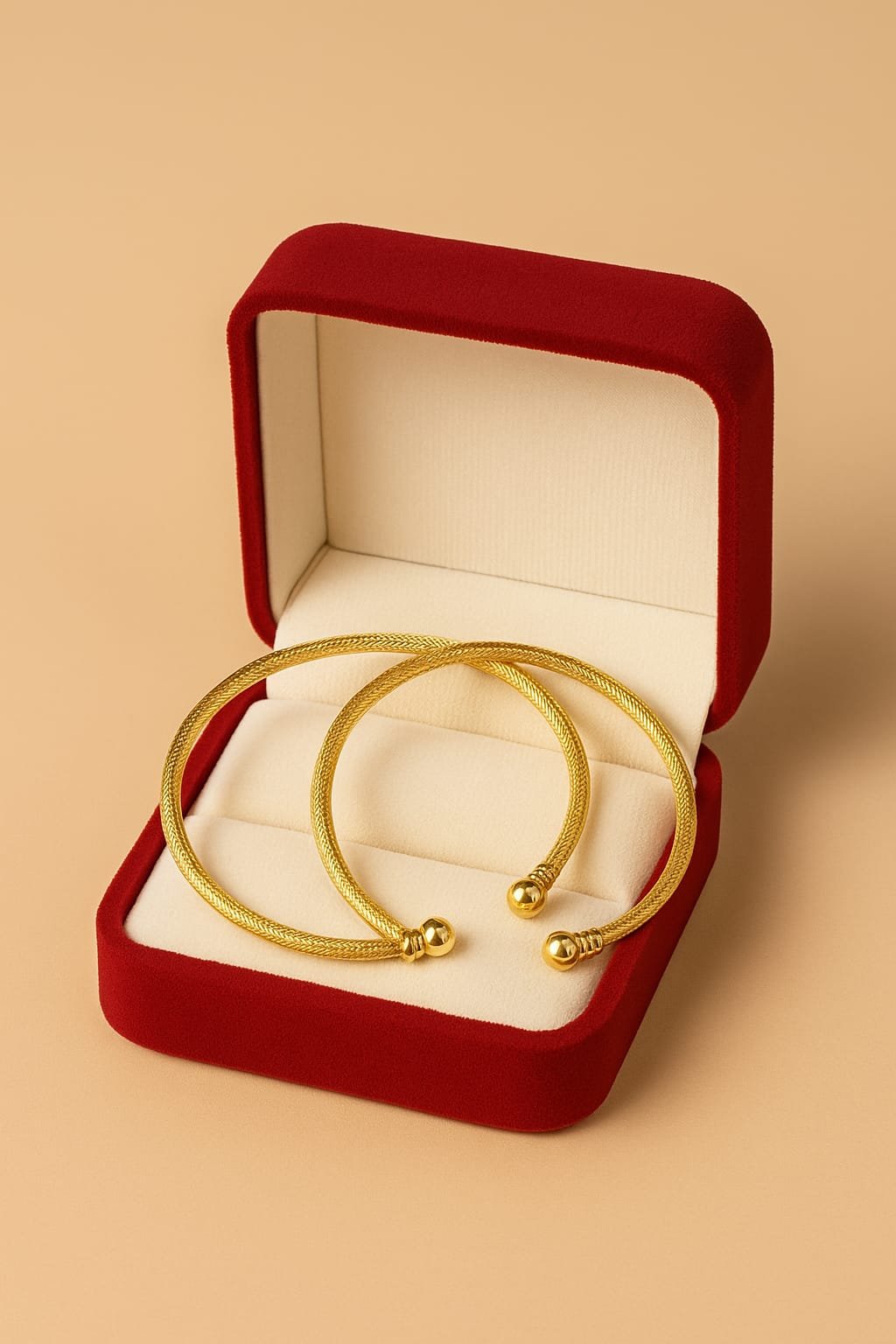 Elegant gold-toned twisted open-ended bangles — lightweight, stackable, and finished with polished bead terminals. Perfect for everyday wear, parties, and gifting; these versatile bangles layer beautifully with both casual and formal outfits.