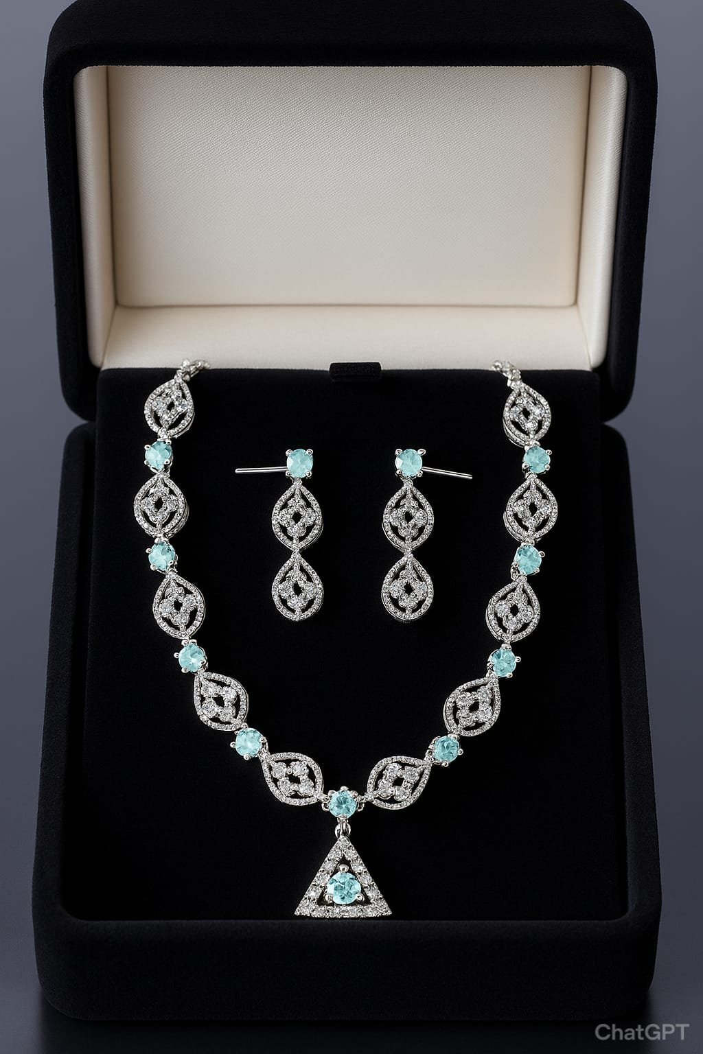 Delicate silver-tone necklace and matching drop earrings with filigree teardrop links accented by mint-green stones — graceful evening set.