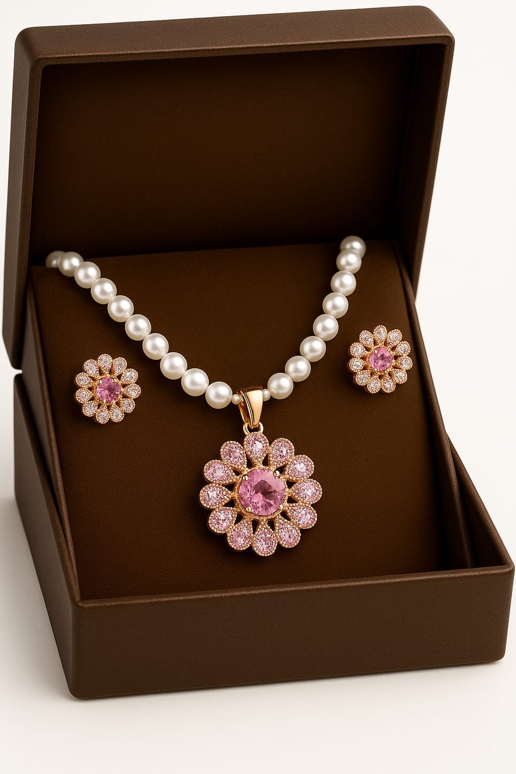 Pink Blossom Pearl Pendant & Earring Set — Elevate any outfit with this elegant jewelry set featuring lustrous faux pearls paired with a sparkling pink floral pendant and matching stud earrings. The dainty flower design is encrusted with pink crystals for eye-catching sparkle, while the classic pearl strand adds timeless sophistication. Perfect for weddings, bridal parties, anniversaries, or everyday glam, this gift-ready set comes beautifully presented in a luxe box.