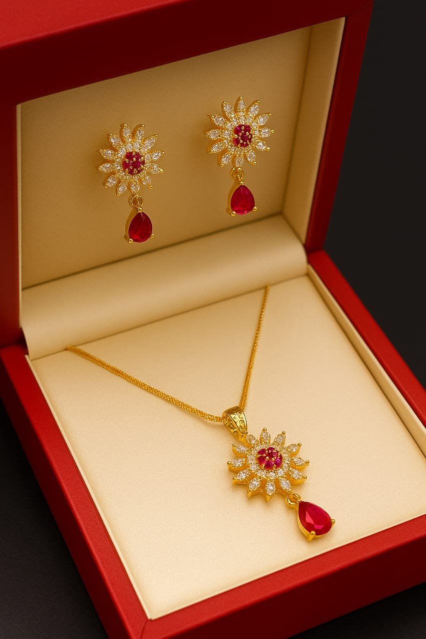 Elegant pendant and matching earrings set featuring a radiant rosette design with shimmering stones and dangling teardrop accents.