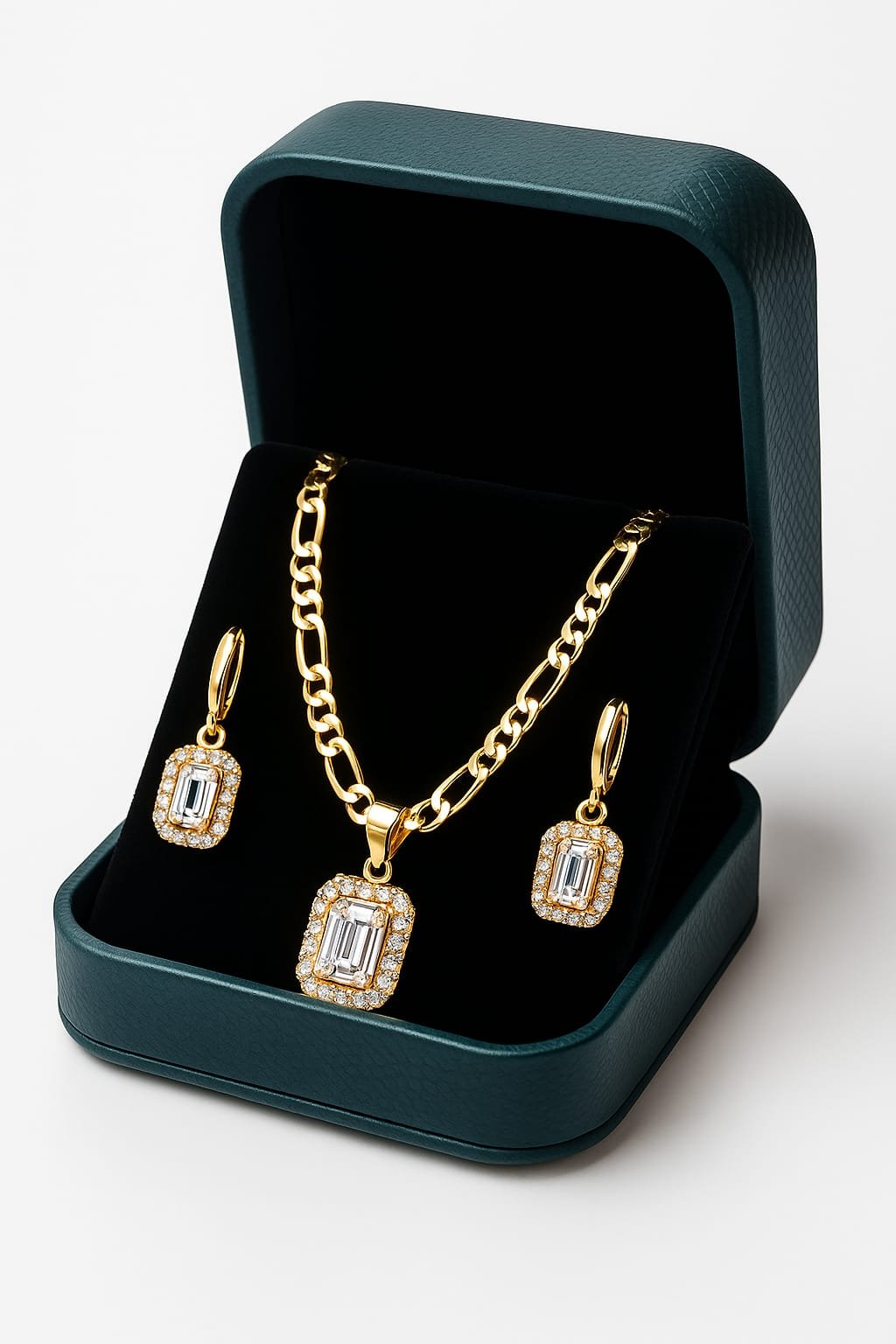 Gold-tone crystal chain with matching drop earrings featuring emerald-cut center stones surrounded by pavé halos — a bold, glamorous set for polished, evening-ready looks.