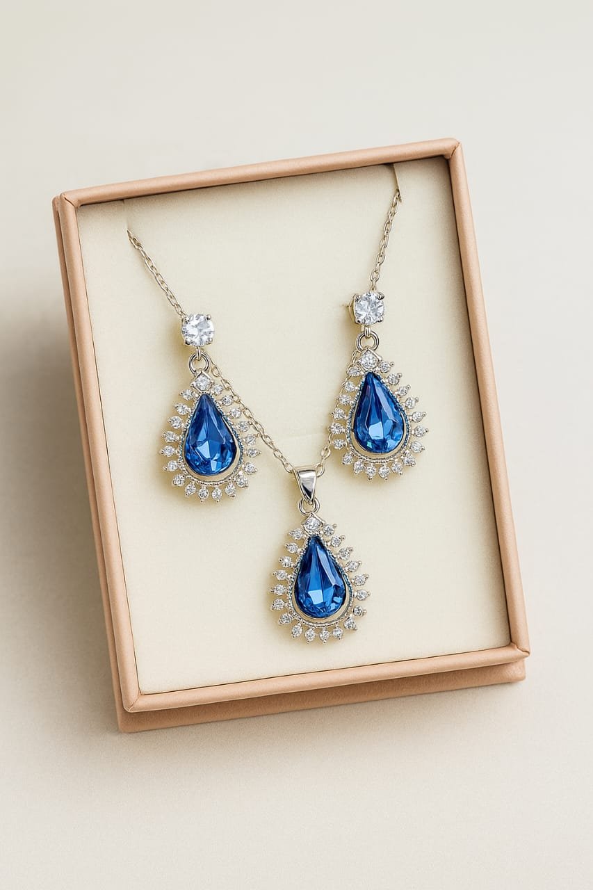 Elegant silver-plated jewelry set featuring deep blue teardrop (sapphire-tone) center stones surrounded by sparkling cubic zirconia halos—perfect for weddings, evening events, or adding classic glamour to any outfit.