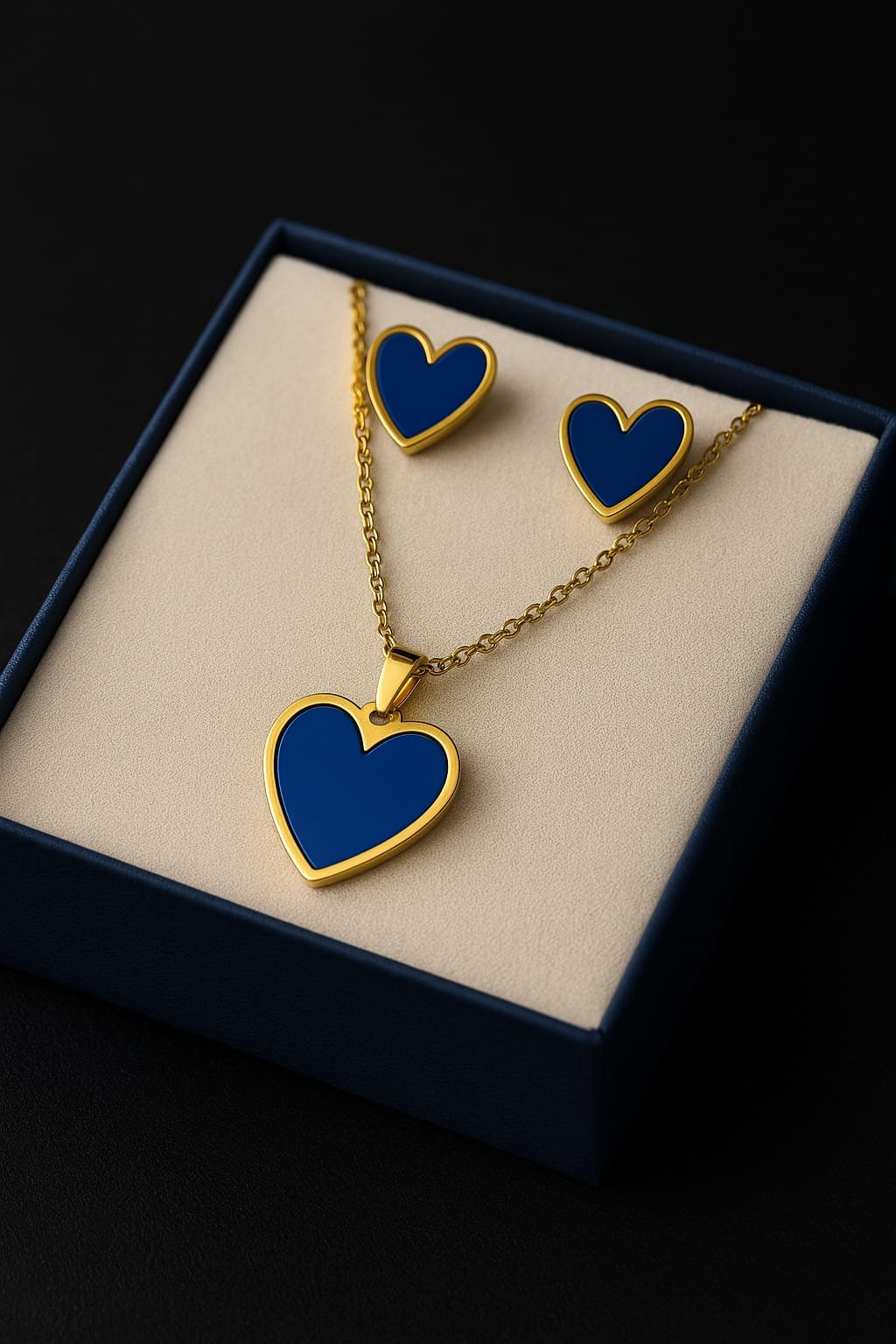 Delicate gold-tone necklace and matching stud earrings featuring bold enamel heart charms with polished frames — a sweet, romantic set perfect for everyday wear or gifting.