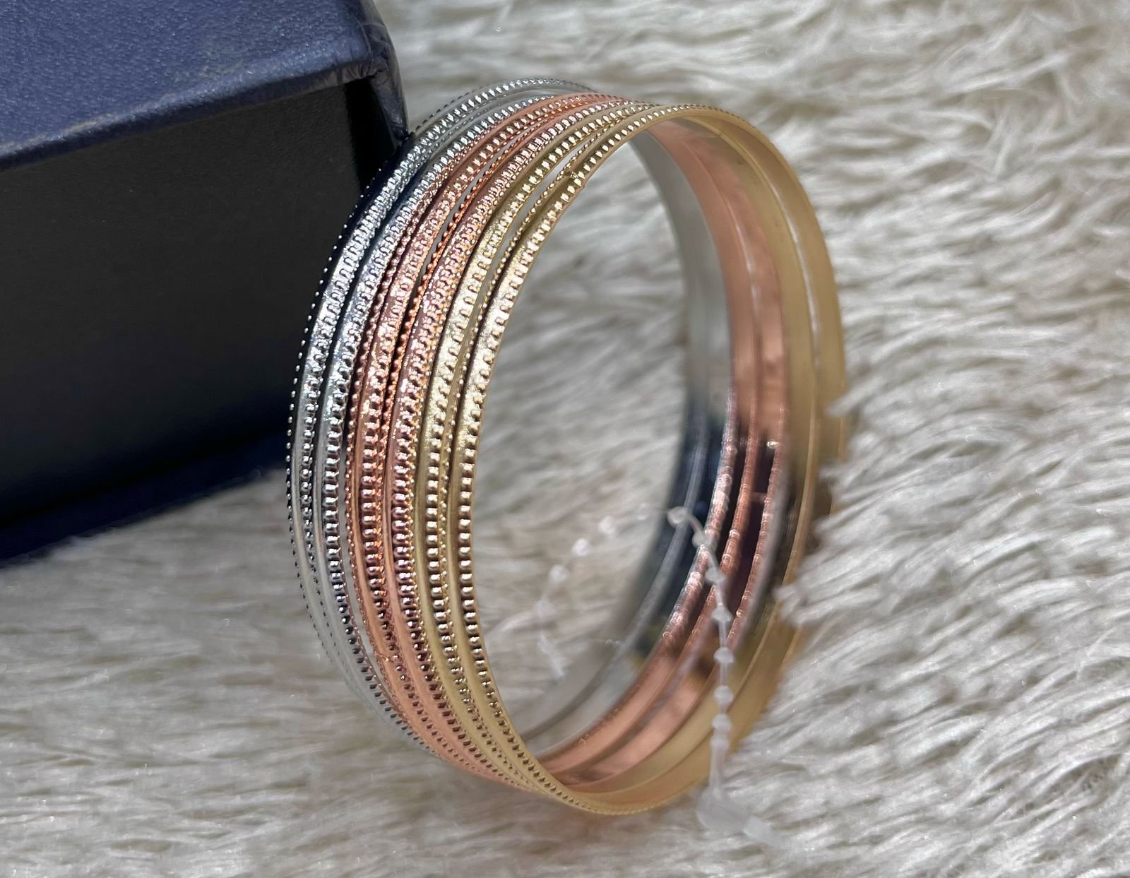Set of tri-tone bangles in gold polished, rose-gold and silver finishes with delicate beaded-edge detailing—lightweight, stackable design that offers timeless elegance for everyday wear or special occasions.