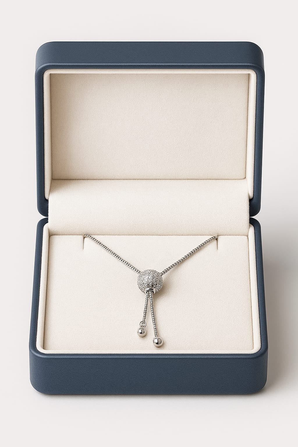 Delicate silver-tone pendant featuring a pavé-studded slider bead with twin tassel drops — designed to be worn on a chain as a lariat-style focal piece. The sliding bead allows adjustable drop length for customizable necklines, making it a versatile choice for layered looks or a refined si