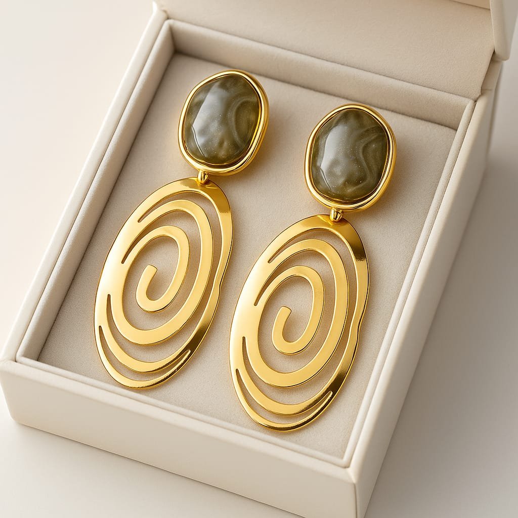 Add modern elegance with these stainless steel spiral drop earrings featuring a marbled stone-inlay stud. Polished gold-tone stainless steel offers lasting shine and tarnish resistance, while the lightweight spiral dangles create eye-catching movement. Hypoallergenic and durable—perfect for everyday wear or statement occasions.