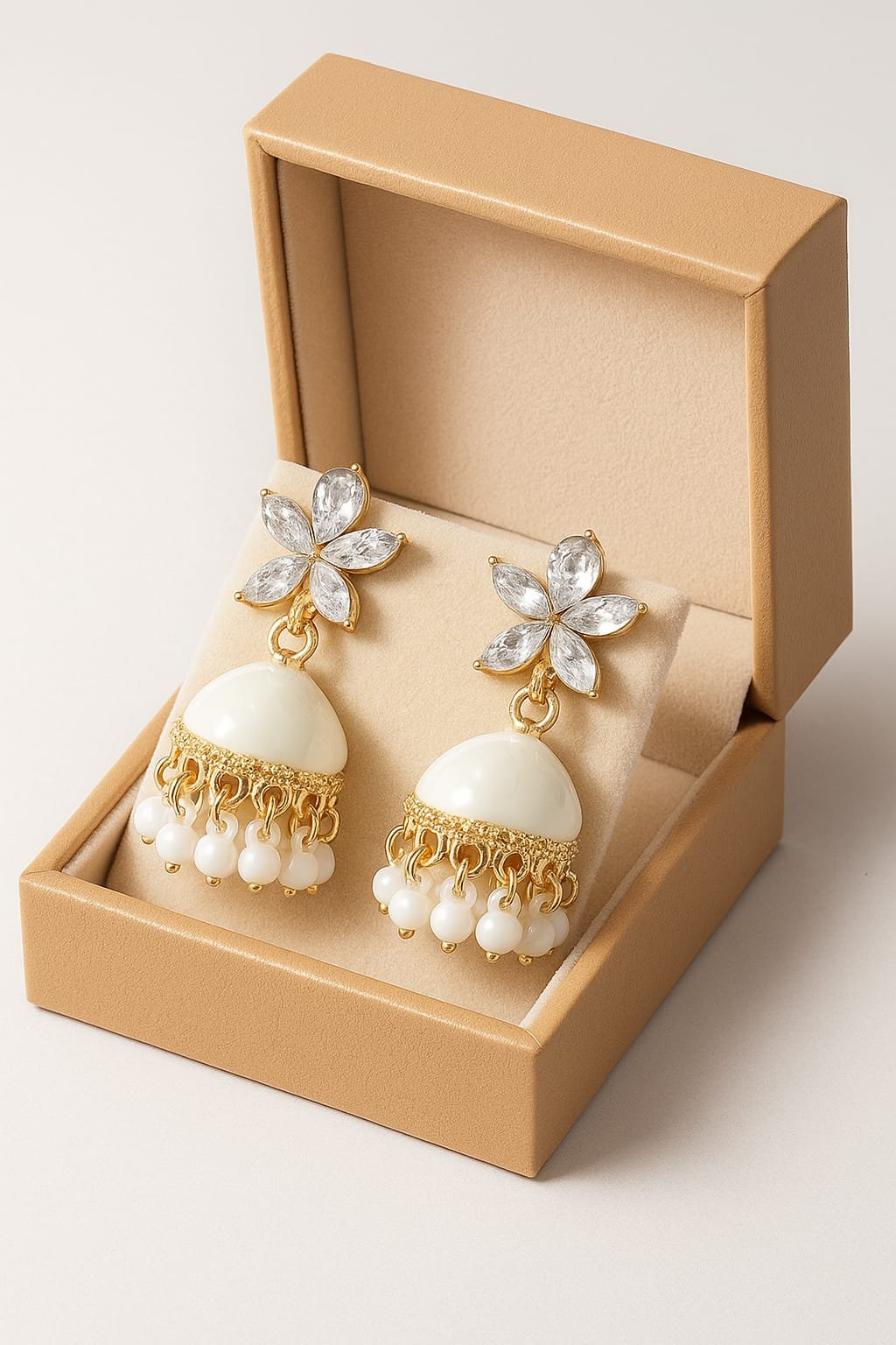 Delicate floral-top jhumka drop earrings featuring a domed bell with ornate fringe beads and crystal-petal studs — traditional-inspired, festive statement pieces ideal for weddings and special occasions.